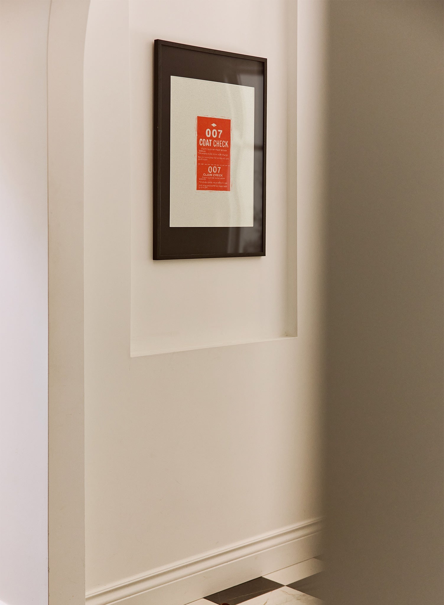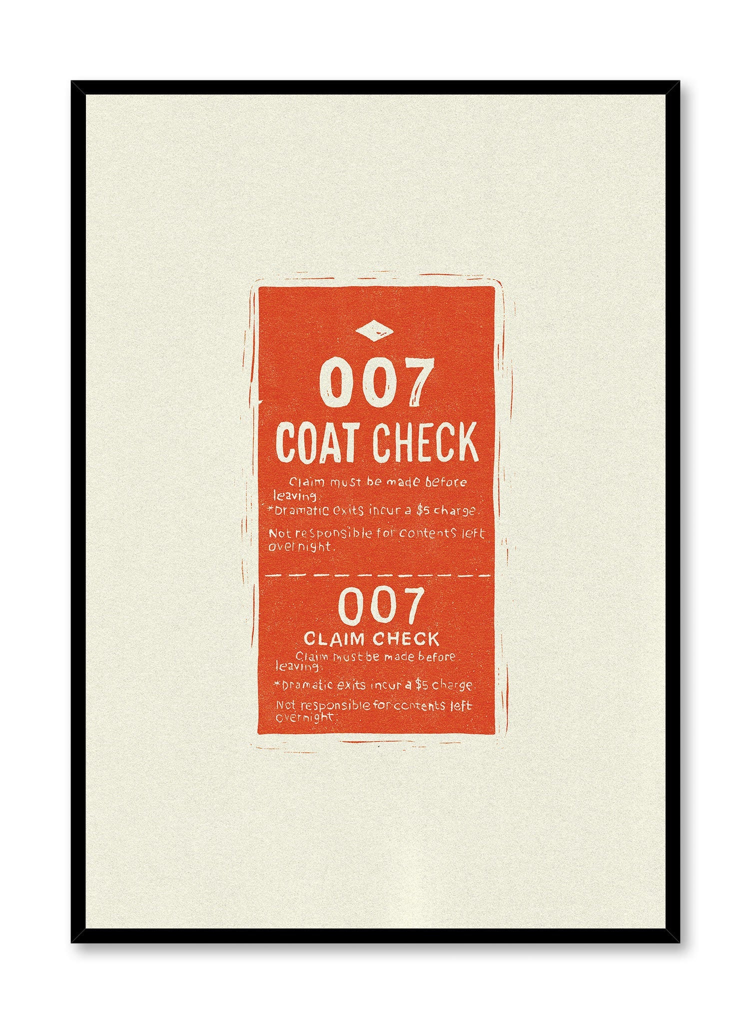 This art print is a witty and stylish take on a classic coat check ticket. The design is rendered in a bold, distressed red, featuring the number '007' for a touch of cinematic flair. The ticket includes playful fine print, warning that 'dramatic exits incur a $5 charge,' adding a layer of cheeky humor to the piece.