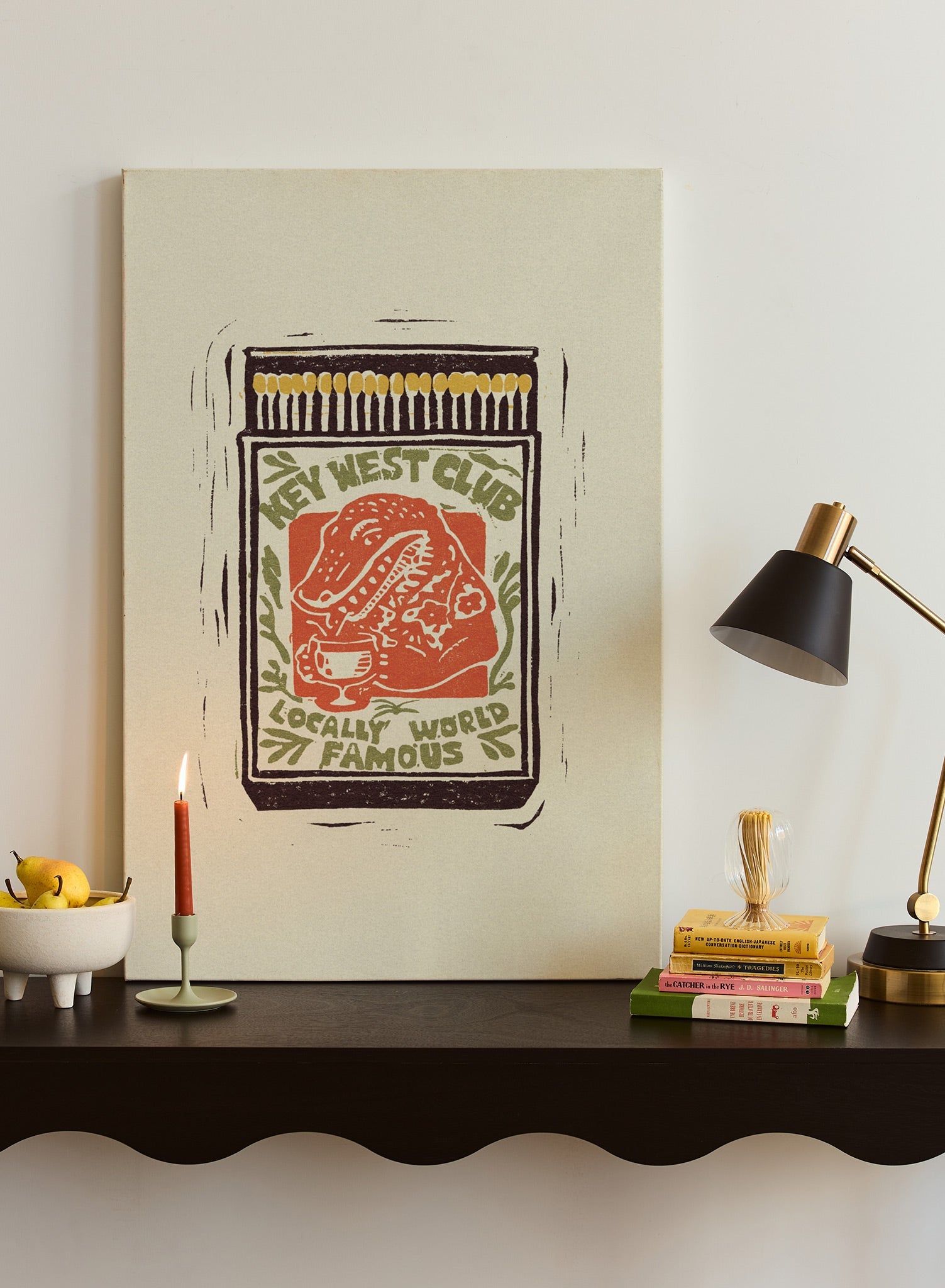 This vibrant linocut print is designed as a matchbook from the 'Key West Club,' a spot that is 'Locally World Famous.' The label features a confident, floral-shirted alligator sipping a cocktail, perfectly capturing a tropical, tongue-in-cheek vibe. The design is a playful nod to classic tiki bar culture and kitschy vacation souvenirs.