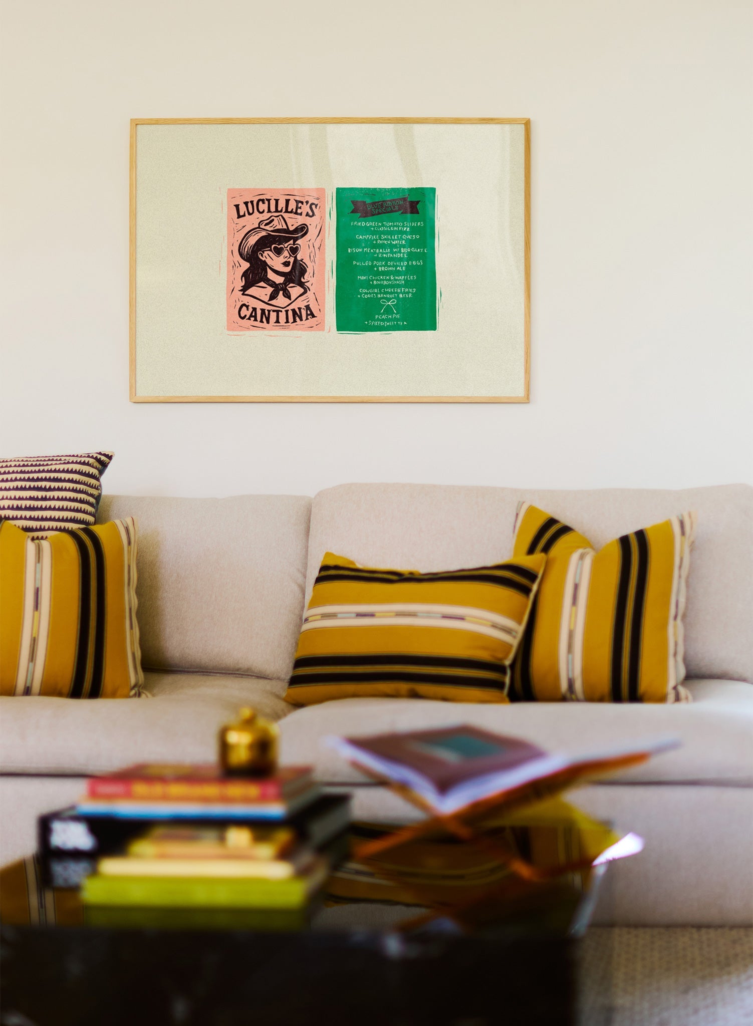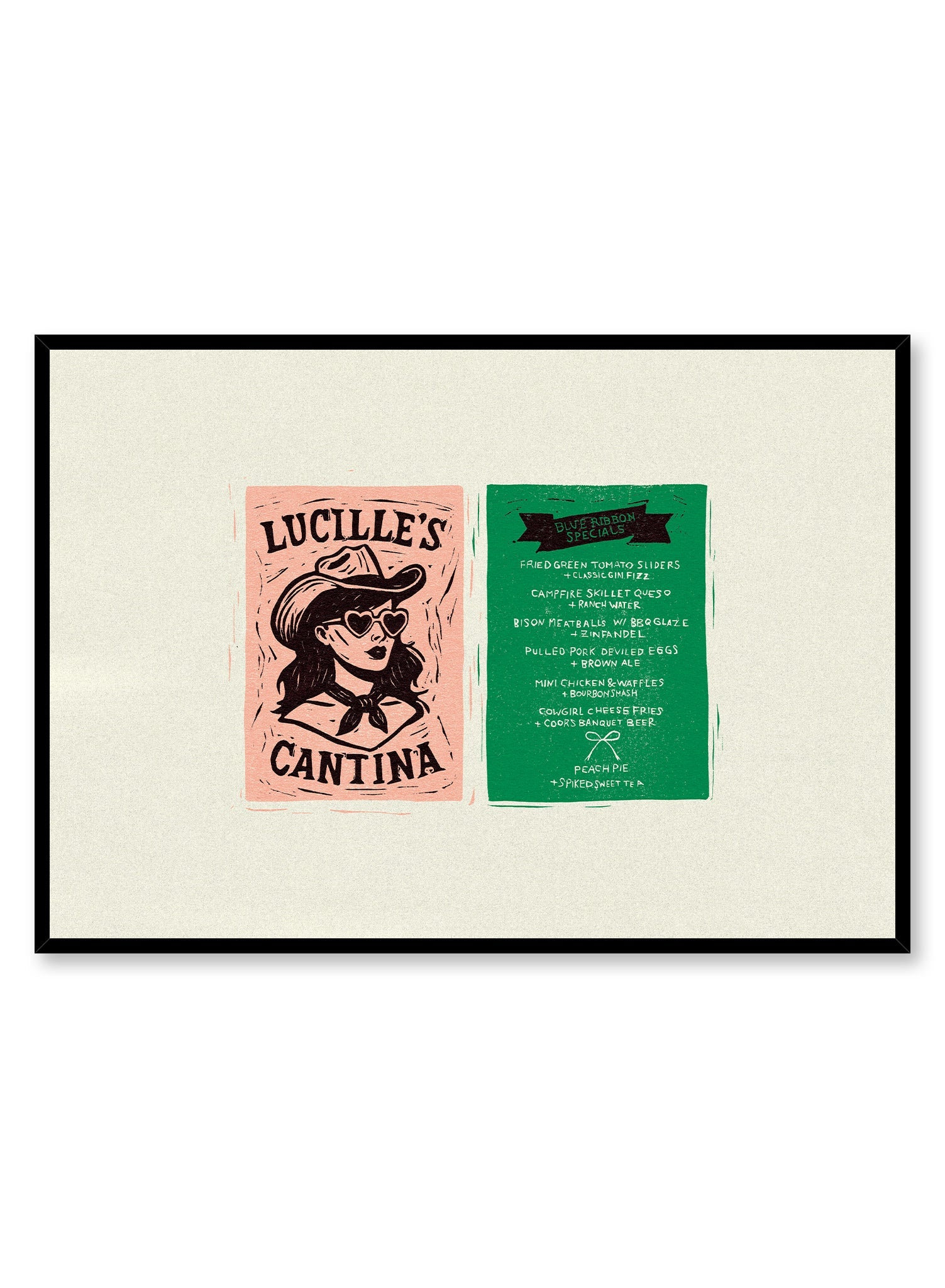 This art print is a playful homage to restaurant ephemera, designed as a diptych of a matchbook and menu from the fictional 'Lucille's Cantina.' A charming illustration of a cowgirl adorns the pink matchbook, while the green menu lists southern-inspired specials in a handwritten script. It’s a clever piece of art that tells a story.